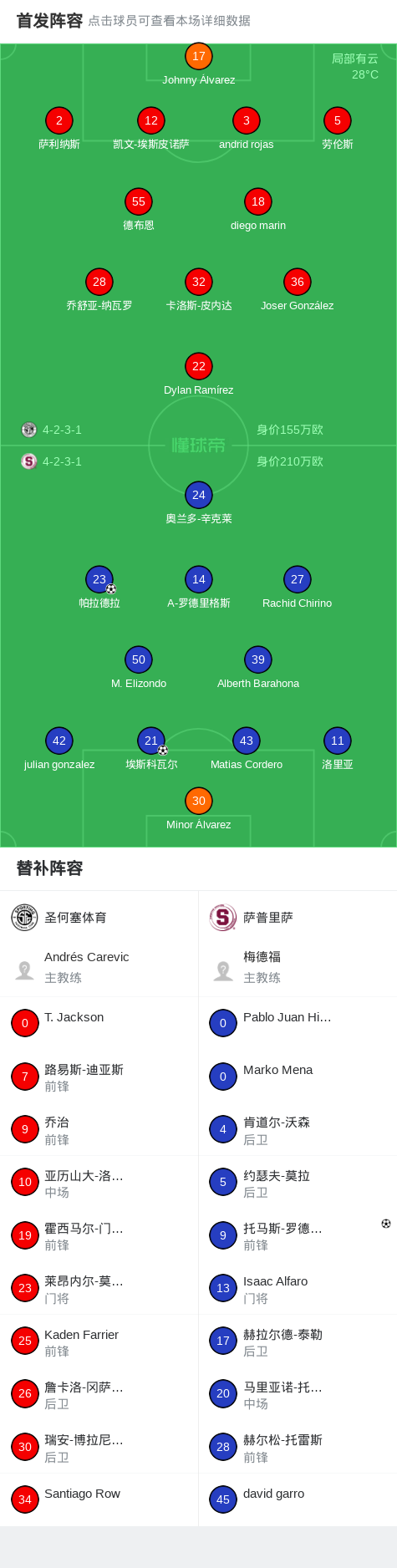 第44分钟,萨普里萨球员埃斯科瓦尔打入一球。