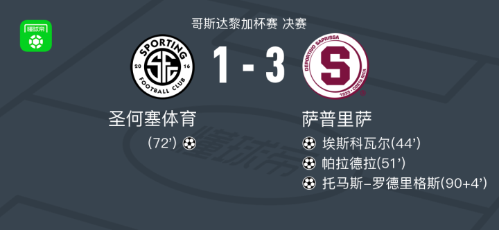 北京时间4月16日哥斯达黎加杯赛 决赛,圣何塞体育对阵萨普里萨。萨普里萨埃斯科瓦尔破门,帕拉德拉破门,托马斯-罗德里格斯破门。最终比分圣何塞体育 13 萨普里萨。