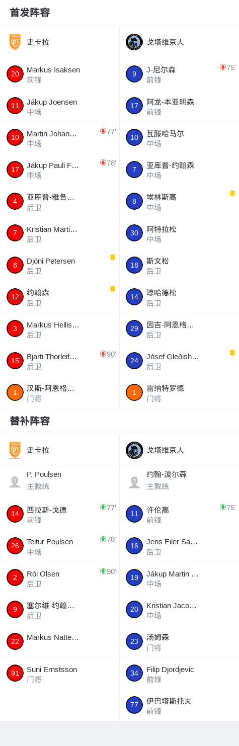 史卡拉0-0戈塔维京人,秋色平分 足球资讯 发布时间: 2026年4月21日 阅读时间: 少于1 分钟 FacebookXPinterestWhatsApp 史卡拉0-0戈塔维京人,秋色平分 北京时间4月21日法罗群岛足球超级联赛 联赛 第6轮,史卡拉主场对阵戈塔维京人。最终比分史卡拉 0–0 戈塔维京人。 点击查看本场比赛详细数据>> 点击查看法罗超完整积分榜>> 球队阵容 技术统计 FacebookXPinterestWhatsApp 1823100https://1823100.com 红单推荐 007 意杯 国际米兰vs科莫 红单推荐 2026年4月21日 005 西甲 毕尔巴鄂竞技vs奥萨苏纳 红单推荐 2026年4月21日 001 意甲 莱切vs佛罗伦萨 红单推荐 2026年4月20日 003 英超 水晶宫vs西汉姆联 红单推荐 2026年4月20日 019 英超 曼城vs阿森纳 红单推荐 2026年4月19日 热门资讯 002 欧联 诺丁汉vs波尔图 红单推荐 2026年4月16日 001 欧联杯 塞尔塔vs弗莱堡 红单推荐 2026年4月16日 雷帕斯3-2逆转基芬,oliver helttunen、Timur Saltykov破门 足球资讯 2026年4月19日 马竞官方:为避免受伤,卢克曼和瑟洛特暂时进行单独训练 足球资讯 2026年4月20日 铁人文明观赛倡议书:同心兴东北,场上是对手,场下是兄弟 足球资讯 2026年4月20日