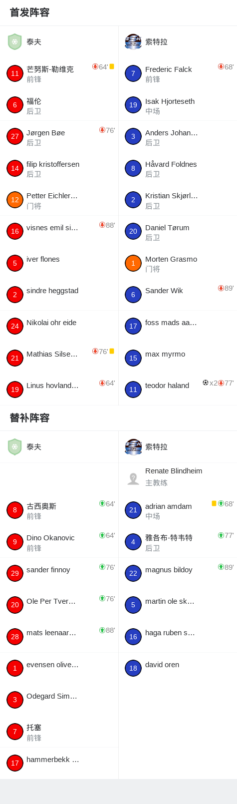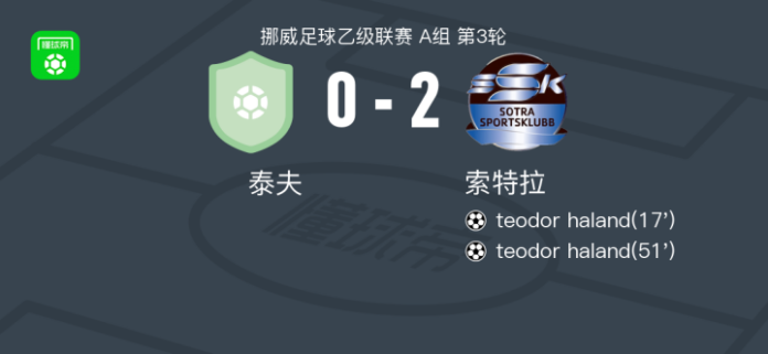 索特拉2-0泰夫,teodor haland包办2球 足球资讯 发布时间: 2026年4月18日 阅读时间: 少于1 分钟 FacebookXPinterestWhatsApp 索特拉2-0泰夫,teodor haland包办2球 北京时间4月18日挪威足球乙级联赛 A组 第3轮,泰夫主场对阵索特拉。索特拉teodor haland梅开二度。最终比分泰夫 0–2 索特拉。 点击查看本场比赛详细数据>> 精彩瞬间 第17分钟,索特拉球员teodor haland打入一球。 第51分钟,索特拉球员teodor haland打入一球。 球队阵容 技术统计 FacebookXPinterestWhatsApp 1823100https://1823100.com 红单推荐 009 挪超 博德闪耀vs奥勒松 红单推荐 2026年4月18日 024 英超 切尔西vs曼联 红单推荐 2026年4月18日 009 朗斯vs图卢兹 红单推荐 2026年4月17日 008 意甲 国米vs卡利亚里 红单推荐 2026年4月17日 002 欧联 诺丁汉vs波尔图 红单推荐 2026年4月16日 热门资讯 012 英超 诺丁汉森林vs阿斯顿维拉 红单推荐 2026年4月12日 三人20+!火箭21分逆转太阳7连胜 KD24分阿门22+11+8 篮球资讯 2026年4月8日 约基奇第198次三双!掘金大胜灰熊豪取10连胜 穆雷26+7+5 篮球资讯 2026年4月9日 004 欧冠 巴萨vs马竞 红单推荐 2026年4月8日 002 欧协联 巴列卡诺vs雅典AEK 红单推荐 2026年4月9日