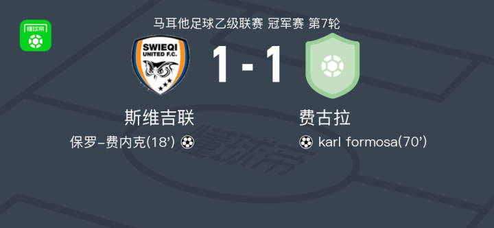北京时间4月19日马耳他足球乙级联赛 冠军赛 第7轮,斯维吉联主场对阵费古拉。斯维吉联保罗-费内克破门。费古拉karl formosa破门。最终比分斯维吉联 1–1 费古拉。