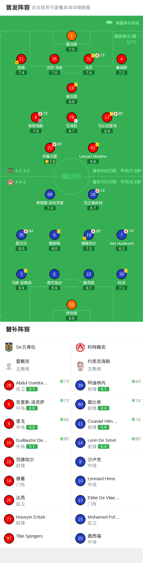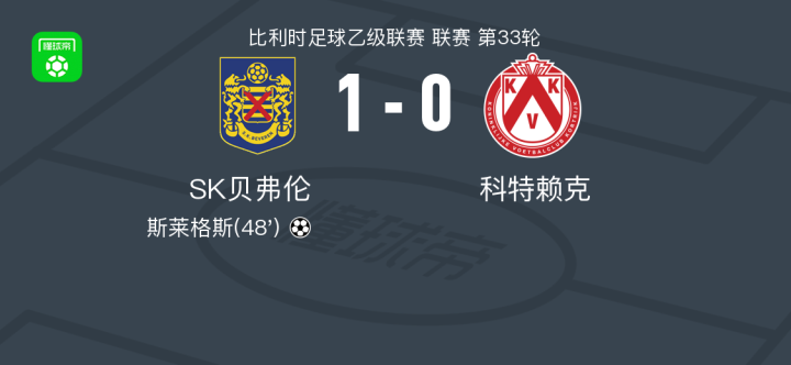 SK贝弗伦1-0科特赖克,斯莱格斯制胜球 足球资讯 发布时间: 2026年4月12日 阅读时间: 少于1 分钟 FacebookXPinterestWhatsApp SK贝弗伦1-0科特赖克,斯莱格斯制胜球 北京时间4月12日比利时足球乙级联赛 联赛 第33轮,SK贝弗伦主场对阵科特赖克。SK贝弗伦斯莱格斯破门。最终比分SK贝弗伦 1–0 科特赖克。 点击查看本场比赛详细数据>> 精彩瞬间 第48分钟,SK贝弗伦球员范埃凯助攻斯莱格斯打入一球。 球队阵容 技术统计 FacebookXPinterestWhatsApp 1823100https://1823100.com 红单推荐 015 西甲 巴萨vs塞尔塔 红单推荐 2026年4月22日 012 英超 伯恩茅斯vs利兹联 红单推荐 2026年4月22日 007 意杯 国际米兰vs科莫 红单推荐 2026年4月21日 005 西甲 毕尔巴鄂竞技vs奥萨苏纳 红单推荐 2026年4月21日 001 意甲 莱切vs佛罗伦萨 红单推荐 2026年4月20日 热门资讯 萨拉戈萨U19 0-0乌德山U19,双方握手言和 足球资讯 2026年4月12日 007 英冠 伊普斯维奇vs米德尔斯堡 红单推荐 2026年4月19日 克莱普尔1-0巴拉卡斯体育,Aaron Caraballo一锤定音 足球资讯 2026年4月13日 曼撒肯0-0哈马索斯,秋色平分 足球资讯 2026年4月23日 019 英超 曼城vs阿森纳 红单推荐 2026年4月19日