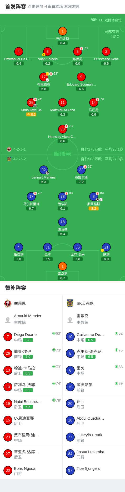 第71分钟,SK贝弗伦球员斯莱格斯助攻Lennart Mertens打入一球。