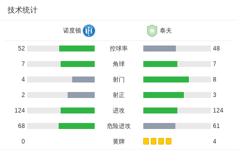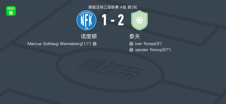 北京时间4月12日挪威足球乙级联赛 A组 第2轮,诺度顿主场对阵泰夫。诺度顿Marcus Solhaug Wenneberg破门。泰夫iver flones破门,sander finnoy破门。最终比分诺度顿 1–2 泰夫。