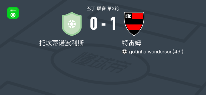 特雷姆1-0托坎蒂诺波利斯,gotinha wanderson制胜 足球资讯 发布时间: 2026年4月20日 阅读时间: 少于1 分钟 FacebookXPinterestWhatsApp 特雷姆1-0托坎蒂诺波利斯,gotinha wanderson制胜 北京时间4月20日巴丁 联赛 第3轮,托坎蒂诺波利斯主场对阵特雷姆。特雷姆gotinha wanderson破门。最终比分托坎蒂诺波利斯 0–1 特雷姆。 点击查看本场比赛详细数据>> 精彩瞬间 第43分钟,特雷姆球员gotinha wanderson打入一球。 技术统计 FacebookXPinterestWhatsApp 1823100https://1823100.com 红单推荐 013 英超 桑德兰vs诺丁汉 红单推荐 2026年4月24日 014 西甲 贝蒂斯vs皇马 红单推荐 2026年4月24日 005 西甲 巴列卡诺vs西班牙人 红单推荐 2026年4月23日 003 西甲 莱万特vs塞维利亚 红单推荐 2026年4月23日 015 西甲 巴萨vs塞尔塔 红单推荐 2026年4月22日 热门资讯 约基奇第198次三双!掘金大胜灰熊豪取10连胜 穆雷26+7+5 篮球资讯 2026年4月9日 三人20+!火箭21分逆转太阳7连胜 KD24分阿门22+11+8 篮球资讯 2026年4月8日 萨拉戈萨U19 0-0乌德山U19,双方握手言和 足球资讯 2026年4月12日 002 欧协联 巴列卡诺vs雅典AEK 红单推荐 2026年4月9日 004 欧冠 巴萨vs马竞 红单推荐 2026年4月8日
