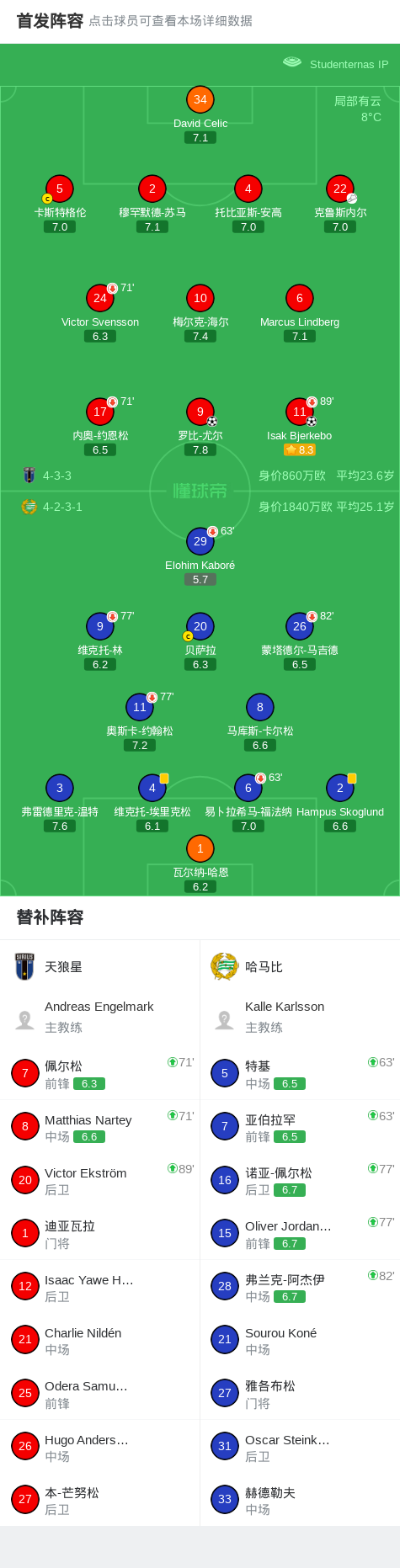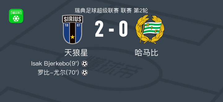 北京时间4月14日瑞典足球超级联赛 联赛 第2轮,天狼星主场对阵哈马比。天狼星Isak Bjerkebo破门,罗比-尤尔破门。最终比分天狼星 2–0 哈马比。