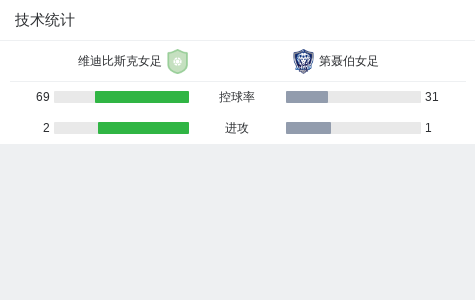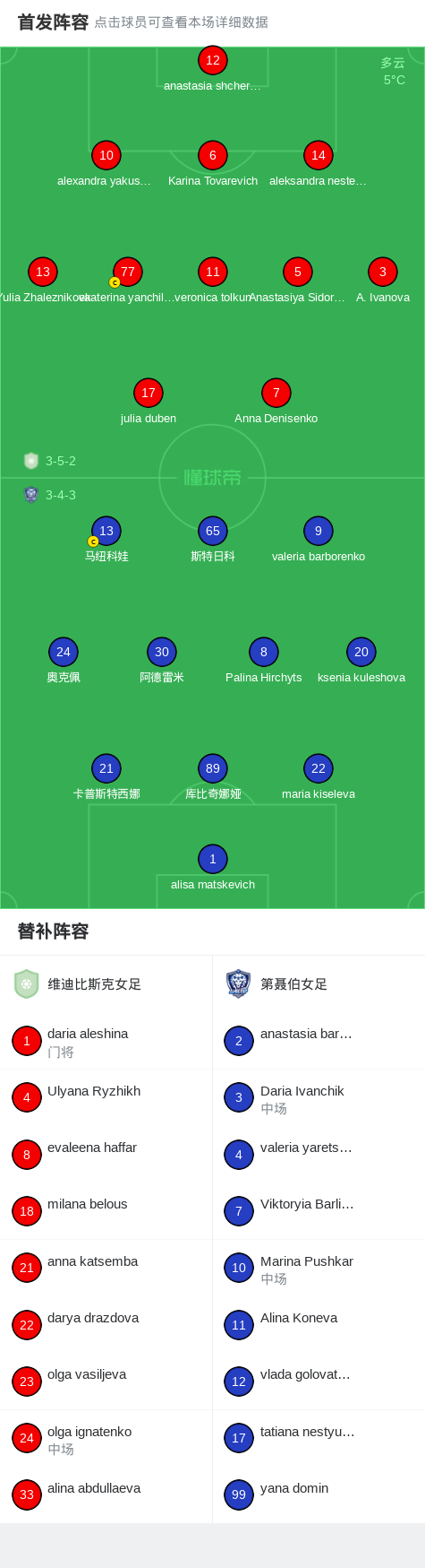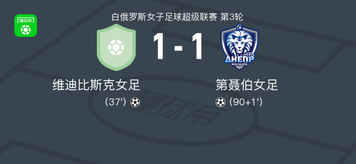 北京时间4月27日白俄罗斯女子足球超级联赛 第3轮,维迪比斯克女足主场对阵第聂伯女足。最终比分维迪比斯克女足 1–1 第聂伯女足。