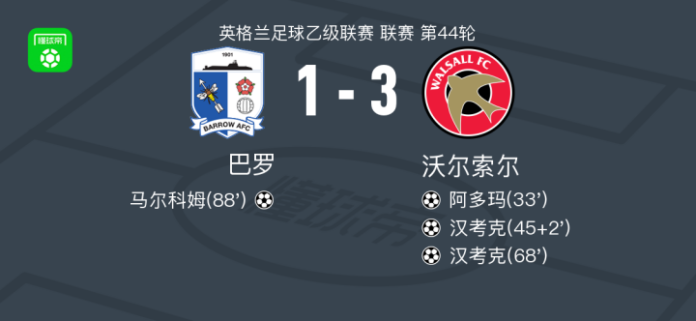 北京时间4月18日英格兰足球乙级联赛 联赛 第44轮,巴罗主场对阵沃尔索尔。巴罗马尔科姆破门。沃尔索尔阿多玛破门,汉考克梅开二度。最终比分巴罗 1–3 沃尔索尔。