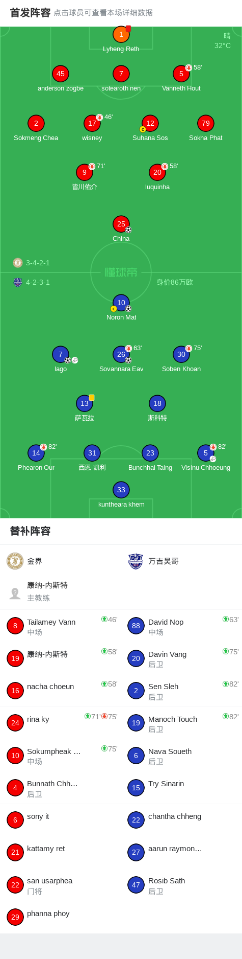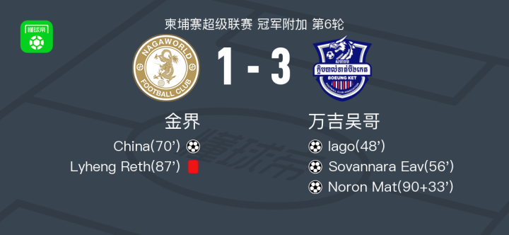 北京时间4月12日柬埔寨超级联赛 冠军附加 第6轮,金界主场对阵万吉吴哥。金界China破门。万吉吴哥Iago破门,Sovannara Eav破门,Noron Mat破门。最终比分纳加科普 1–3 万吉吴哥。