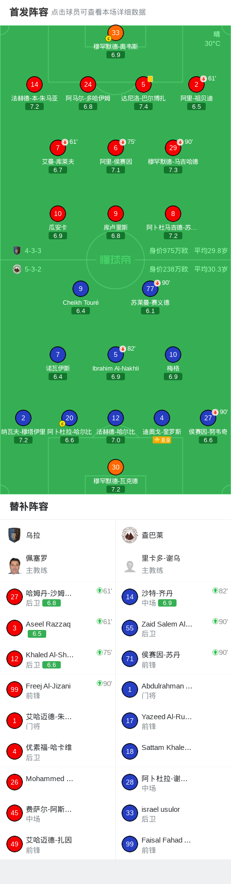 乌拉0-0查巴莱,势均力敌 足球资讯 发布时间: 2026年4月21日 阅读时间: 少于1 分钟 FacebookXPinterestWhatsApp 乌拉0-0查巴莱,势均力敌 北京时间4月21日沙特阿拉伯甲级联赛 联赛 第30轮,乌拉主场对阵查巴莱。最终比分乌拉 0–0 查巴莱。 点击查看本场比赛详细数据>> 球队阵容 技术统计 FacebookXPinterestWhatsApp 1823100https://1823100.com 红单推荐 007 意杯 国际米兰vs科莫 红单推荐 2026年4月21日 005 西甲 毕尔巴鄂竞技vs奥萨苏纳 红单推荐 2026年4月21日 001 意甲 莱切vs佛罗伦萨 红单推荐 2026年4月20日 003 英超 水晶宫vs西汉姆联 红单推荐 2026年4月20日 019 英超 曼城vs阿森纳 红单推荐 2026年4月19日 热门资讯 001 欧联杯 塞尔塔vs弗莱堡 红单推荐 2026年4月16日 002 欧联 诺丁汉vs波尔图 红单推荐 2026年4月16日 雷帕斯3-2逆转基芬,oliver helttunen、Timur Saltykov破门 足球资讯 2026年4月19日 阿韦洛亚:卡马文加拥有我和俱乐部的信任,希望他待很多年 足球资讯 2026年4月20日 还能这么玩,奥德里奥索拉夺冠后把女儿塞进了国王杯奖杯里 足球资讯 2026年4月20日