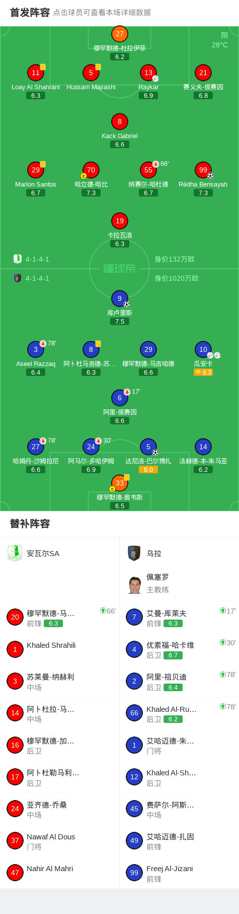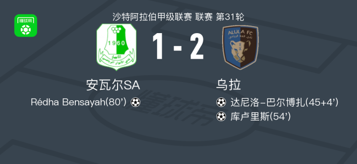 北京时间4月28日沙特阿拉伯甲级联赛 联赛 第31轮,安瓦尔SA主场对阵乌拉。安瓦尔SARédha Bensayah破门。乌拉达尼洛-巴尔博扎破门,库卢里斯破门。最终比分安瓦尔SA 1–2 乌拉。