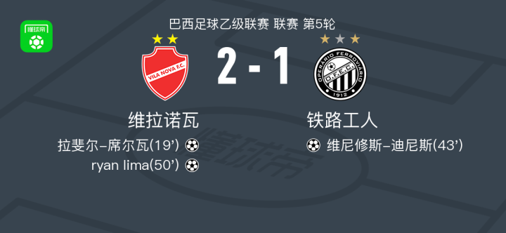 北京时间4月19日巴西足球乙级联赛 联赛 第5轮,维拉诺瓦主场对阵铁路工人。维拉诺瓦拉斐尔-席尔瓦破门,ryan lima破门。铁路工人维尼修斯-迪尼斯破门。最终比分维拉诺瓦 2–1 铁路工人。