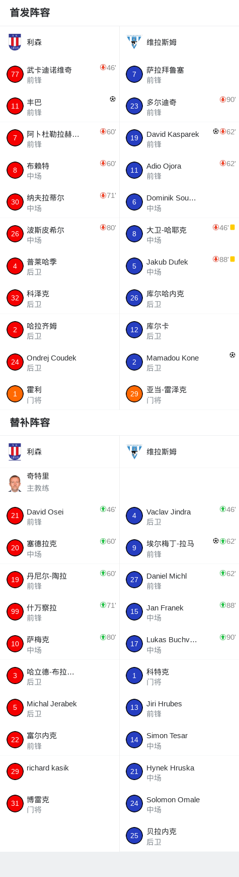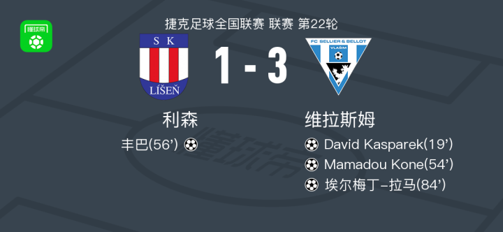 北京时间4月12日捷克足球全国联赛 联赛 第22轮,利森主场对阵维拉斯姆。利森丰巴破门。维拉斯姆David Kasparek破门,Mamadou Kone破门,埃尔梅丁-拉马破门。最终比分利森 1–3 维拉斯姆。