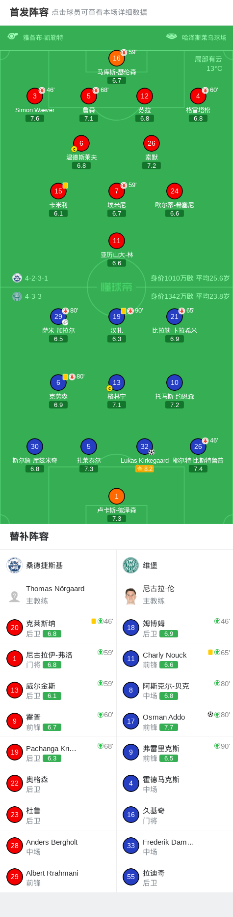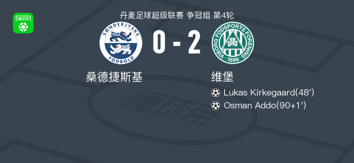 北京时间4月12日丹麦足球超级联赛 争冠组 第4轮,桑德捷斯基主场对阵维堡。维堡Lukas Kirkegaard破门,Osman Addo破门。最终比分桑德捷斯基 0–2 维堡。