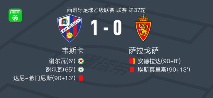 北京时间4月27日西班牙足球乙级联赛 联赛 第37轮,韦斯卡主场对阵萨拉戈萨。韦斯卡谢尔瓦破门。最终比分韦斯卡 1–0 萨拉戈萨。
