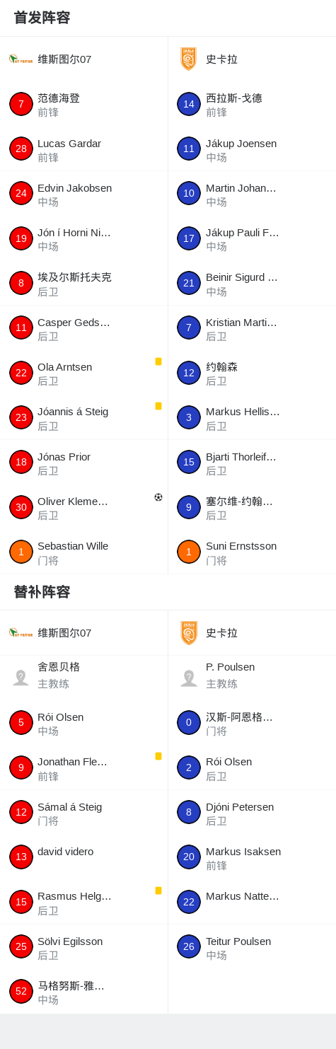 维斯图尔07 1-0史卡拉,Oliver Klemensen助球队取胜 足球资讯 发布时间: 2026年4月17日 阅读时间: 少于1 分钟 FacebookXPinterestWhatsApp 维斯图尔07 1-0史卡拉,Oliver Klemensen助球队取胜 北京时间4月17日法罗群岛杯足球赛 第一轮,维斯图尔07对阵史卡拉。维斯图尔07Oliver Klemensen破门。最终比分维斯图尔07 1–0 史卡拉。 点击查看本场比赛详细数据>> 精彩瞬间 第21分钟,维斯图尔07球员Oliver Klemensen打入一球。 球队阵容 技术统计 FacebookXPinterestWhatsApp 1823100https://1823100.com 红单推荐 007 意杯 国际米兰vs科莫 红单推荐 2026年4月21日 005 西甲 毕尔巴鄂竞技vs奥萨苏纳 红单推荐 2026年4月21日 001 意甲 莱切vs佛罗伦萨 红单推荐 2026年4月20日 003 英超 水晶宫vs西汉姆联 红单推荐 2026年4月20日 019 英超 曼城vs阿森纳 红单推荐 2026年4月19日 热门资讯 三人20+!火箭21分逆转太阳7连胜 KD24分阿门22+11+8 篮球资讯 2026年4月8日 004 欧冠 巴萨vs马竞 红单推荐 2026年4月8日 007 意杯 国际米兰vs科莫 红单推荐 2026年4月21日 马卡:巴萨进入“换代期”,五位球员或将离队 足球资讯 2026年4月21日 019 英超 曼城vs阿森纳 红单推荐 2026年4月19日