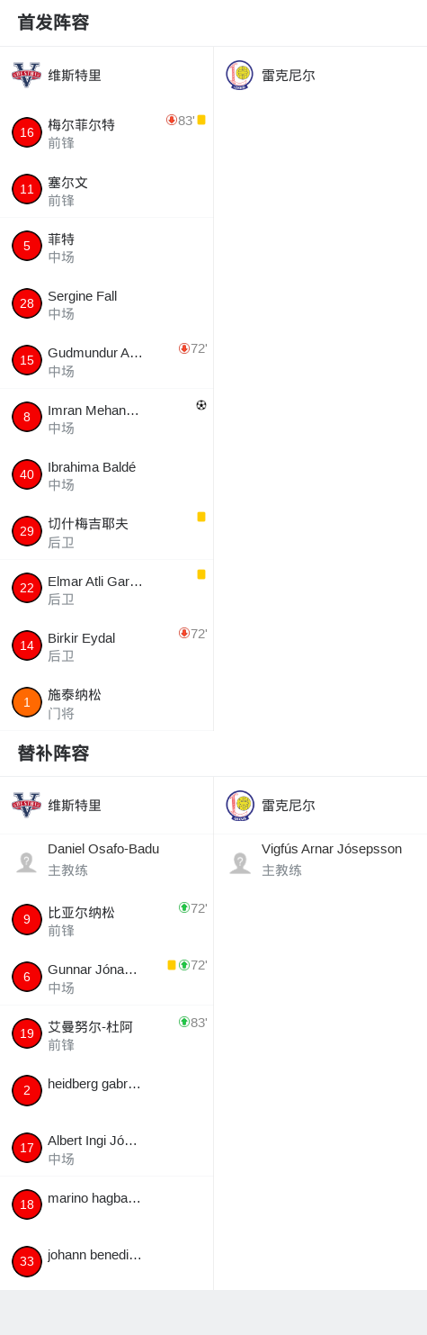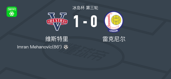 维斯特里1-0雷克尼尔,Imran Mehanovic绝杀 足球资讯 发布时间: 2026年4月12日 阅读时间: 少于1 分钟 FacebookXPinterestWhatsApp 维斯特里1-0雷克尼尔,Imran Mehanovic绝杀 北京时间4月12日冰岛杯 第三轮,维斯特里对阵雷克尼尔。维斯特里Imran Mehanovic破门。最终比分维斯特里 1–0 雷克尼尔。 点击查看本场比赛详细数据>> 精彩瞬间 第86分钟,维斯特里球员Imran Mehanovic打入一球。 球队阵容 FacebookXPinterestWhatsApp 1823100https://1823100.com 红单推荐 023 英超 阿森纳vs纽卡斯尔 红单推荐 2026年4月25日 016 英超 狼队vs热刺 红单推荐 2026年4月25日 013 英超 桑德兰vs诺丁汉 红单推荐 2026年4月24日 014 西甲 贝蒂斯vs皇马 红单推荐 2026年4月24日 005 西甲 巴列卡诺vs西班牙人 红单推荐 2026年4月23日 热门资讯 三人20+!火箭21分逆转太阳7连胜 KD24分阿门22+11+8 篮球资讯 2026年4月8日 约基奇第198次三双!掘金大胜灰熊豪取10连胜 穆雷26+7+5 篮球资讯 2026年4月9日 002 欧协联 巴列卡诺vs雅典AEK 红单推荐 2026年4月9日 001 意甲 莱切vs佛罗伦萨 红单推荐 2026年4月20日 016 英超 狼队vs热刺 红单推荐 2026年4月25日