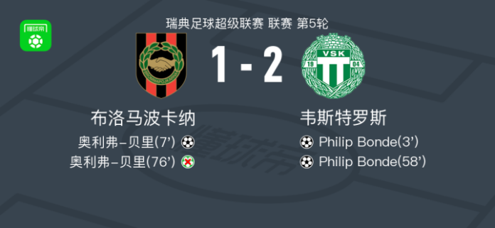 北京时间4月26日瑞典足球超级联赛 联赛 第5轮,布洛马波卡纳主场对阵韦斯特罗斯。布洛马波卡纳奥利弗-贝里破门。韦斯特罗斯Philip Bonde梅开二度。最终比分布洛马波卡纳 1–2 韦斯特罗斯。