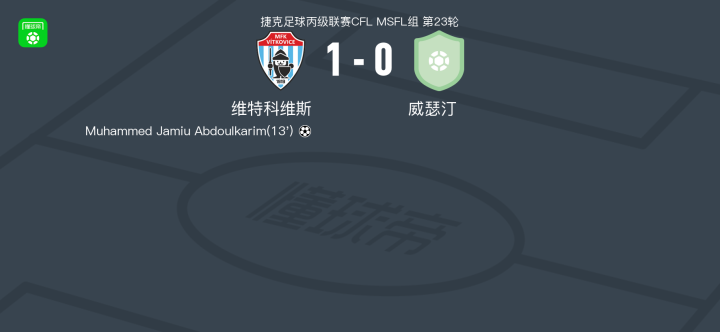 北京时间4月12日捷克足球丙级联赛CFL MSFL组 第23轮,维特科维斯主场对阵威瑟汀。维特科维斯Muhammed Jamiu Abdoulkarim破门。最终比分维特科维斯 10 威瑟汀。