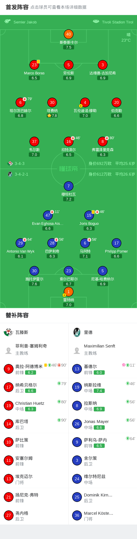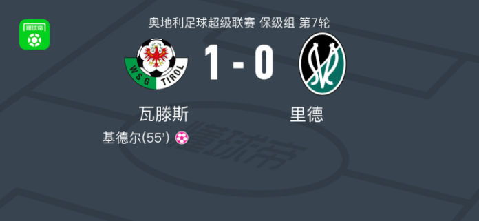 瓦滕斯1-0里德 足球资讯 发布时间: 2026年4月26日 阅读时间: 少于1 分钟 FacebookXPinterestWhatsApp 瓦滕斯1-0里德 北京时间4月25日奥地利足球超级联赛 保级组 第7轮,瓦滕斯主场对阵里德。里德基德尔自摆乌龙。最终比分瓦滕斯 1–0 里德。 点击查看本场比赛详细数据>> 点击查看奥超完整积分榜>> 精彩瞬间 第55分钟,里德球员基德尔自摆乌龙。 球队阵容 技术统计 FacebookXPinterestWhatsApp 1823100https://1823100.com 红单推荐 023 英超 阿森纳vs纽卡斯尔 红单推荐 2026年4月25日 016 英超 狼队vs热刺 红单推荐 2026年4月25日 013 英超 桑德兰vs诺丁汉 红单推荐 2026年4月24日 014 西甲 贝蒂斯vs皇马 红单推荐 2026年4月24日 005 西甲 巴列卡诺vs西班牙人 红单推荐 2026年4月23日 热门资讯 约基奇第198次三双!掘金大胜灰熊豪取10连胜 穆雷26+7+5 篮球资讯 2026年4月9日 005 西甲 巴列卡诺vs西班牙人 红单推荐 2026年4月23日 002 欧协联 巴列卡诺vs雅典AEK 红单推荐 2026年4月9日 023 英超 阿森纳vs纽卡斯尔 红单推荐 2026年4月25日 003 西甲 莱万特vs塞维利亚 红单推荐 2026年4月23日