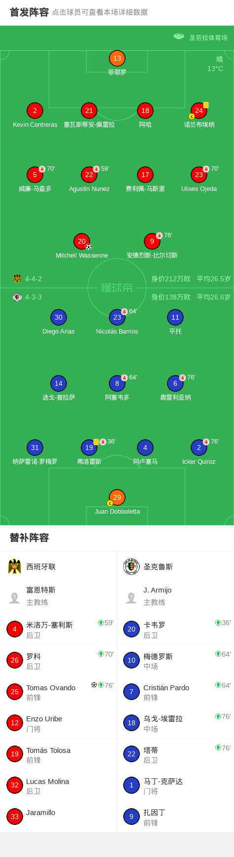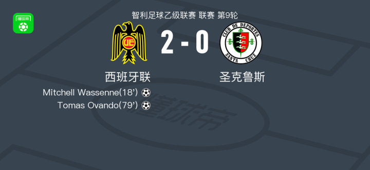 北京时间4月27日智利足球乙级联赛 联赛 第9轮,西班牙联主场对阵圣克鲁斯。西班牙联Mitchell Wassenne破门,Tomas Ovando破门。最终比分西班牙联 2–0 圣克鲁斯。