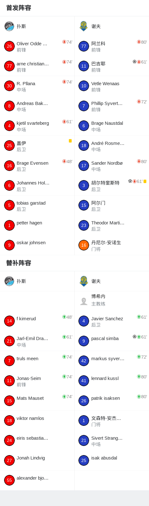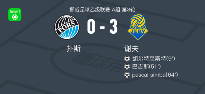 北京时间4月18日挪威足球乙级联赛 A组 第3轮,扑斯主场对阵谢夫。谢夫胡尔特奎斯特破门,巴吉耶破门,pascal simba破门。最终比分扑斯 0–3 谢夫。