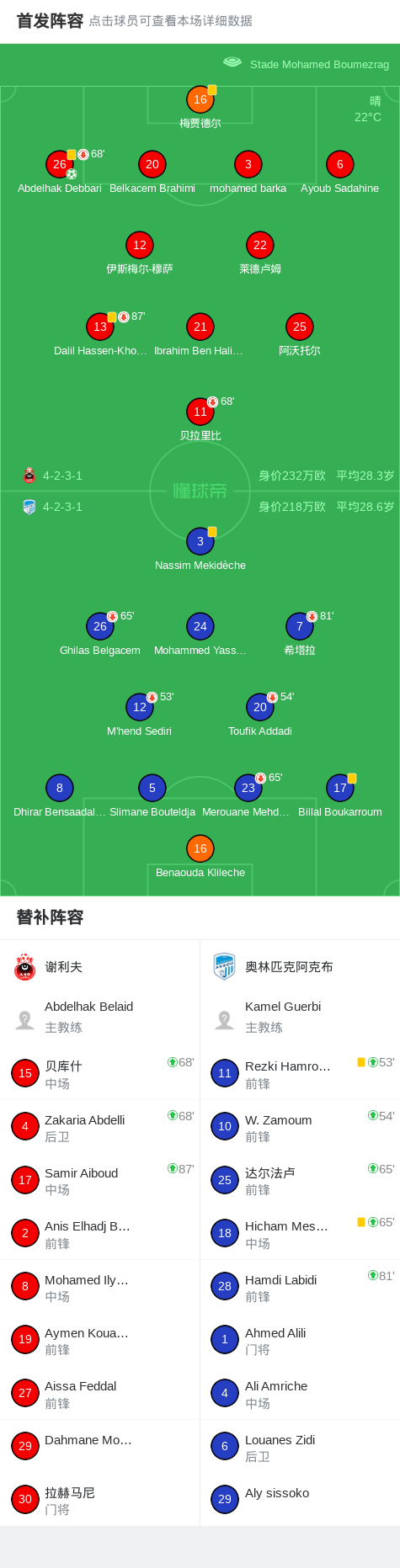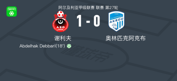 谢利夫1-0奥林匹克阿克布,Abdelhak Debbari点射制胜 足球资讯 发布时间: 2026年4月18日 阅读时间: 少于1 分钟 FacebookXPinterestWhatsApp 谢利夫1-0奥林匹克阿克布,Abdelhak Debbari点射制胜 北京时间4月18日阿尔及利亚甲级联赛 联赛 第27轮,谢利夫主场对阵奥林匹克阿克布。谢利夫Abdelhak Debbari破门。最终比分谢利夫 1–0 奥林匹克阿克布。 点击查看本场比赛详细数据>> 点击查看阿尔甲完整积分榜>> 精彩瞬间 第18分钟,谢利夫球员Abdelhak Debbari罚入点球。 球队阵容 技术统计 FacebookXPinterestWhatsApp 1823100https://1823100.com 红单推荐 015 西甲 巴萨vs塞尔塔 红单推荐 2026年4月22日 012 英超 伯恩茅斯vs利兹联 红单推荐 2026年4月22日 007 意杯 国际米兰vs科莫 红单推荐 2026年4月21日 005 西甲 毕尔巴鄂竞技vs奥萨苏纳 红单推荐 2026年4月21日 001 意甲 莱切vs佛罗伦萨 红单推荐 2026年4月20日 热门资讯 萨拉戈萨U19 0-0乌德山U19,双方握手言和 足球资讯 2026年4月12日 克莱普尔1-0巴拉卡斯体育,Aaron Caraballo一锤定音 足球资讯 2026年4月13日 萨拉赫安菲尔德英超进108球,联赛历史单座球场进球仅次于亨利 足球资讯 2026年4月12日 萨拉赫英超打入157粒非点球进球,追平阿圭罗列历史第五 足球资讯 2026年4月12日 郑大世:森保一执教风格很有人情味;日本队还得日本人执教 足球资讯 2026年4月23日
