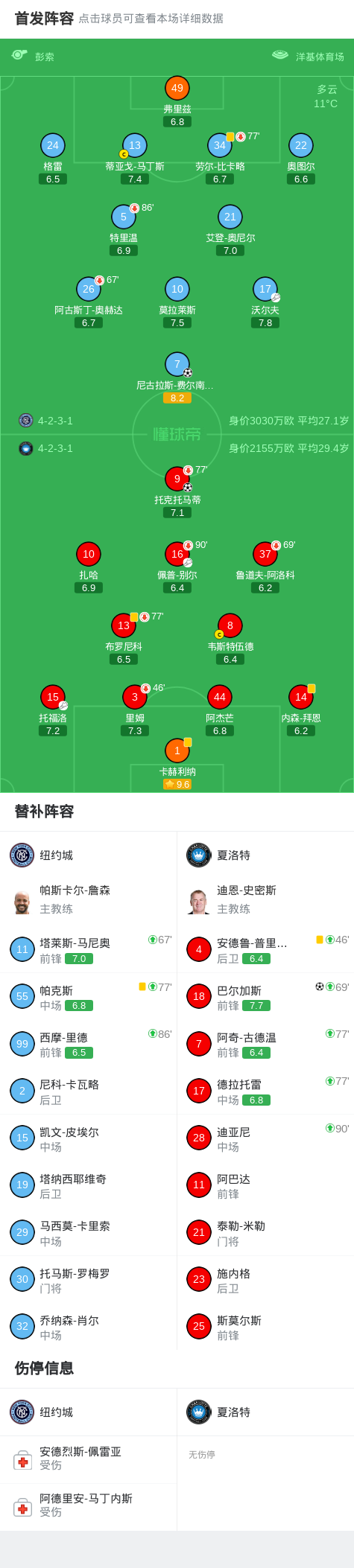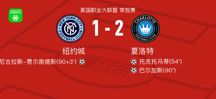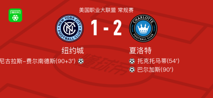 北京时间4月19日美国职业大联盟 常规赛,纽约城主场对阵夏洛特。纽约城尼古拉斯-费尔南德斯破门。夏洛特托克托马蒂破门,巴尔加斯破门。最终比分纽约城 1–2 夏洛特。