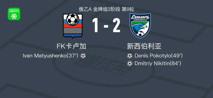 北京时间4月19日俄乙A 金牌组2阶段 第9轮,FK卡卢加对阵新西伯利亚。FK卡卢加Ivan Matyushenko破门。新西伯利亚Denis Pokotylo破门,Dmitriy Nikitin破门。最终比分FK卡卢加 1–2 新西伯利亚。