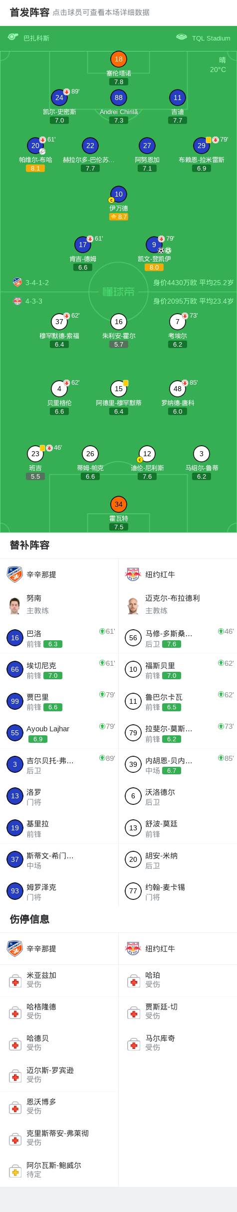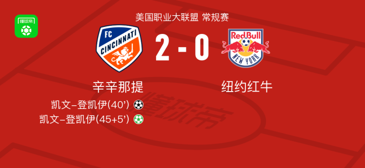 辛辛那提2-0纽约红牛,凯文-登凯伊独中两元 足球资讯 发布时间: 2026年4月26日 阅读时间: 少于1 分钟 FacebookXPinterestWhatsApp 辛辛那提2-0纽约红牛,凯文-登凯伊独中两元 北京时间4月26日美国职业大联盟 常规赛,辛辛那提主场对阵纽约红牛。辛辛那提凯文-登凯伊梅开二度。最终比分辛辛那提 2–0 纽约红牛。 点击查看本场比赛详细数据>> 点击查看美职联完整积分榜>> 精彩瞬间 第40分钟,辛辛那提球员帕维尔-布哈助攻凯文-登凯伊打入一球。 上半场补时第5分钟,辛辛那提球员凯文-登凯伊罚入点球。 球队阵容 技术统计 FacebookXPinterestWhatsApp 1823100https://1823100.com 红单推荐 023 英超 阿森纳vs纽卡斯尔 红单推荐 2026年4月25日 016 英超 狼队vs热刺 红单推荐 2026年4月25日 013 英超 桑德兰vs诺丁汉 红单推荐 2026年4月24日 014 西甲 贝蒂斯vs皇马 红单推荐 2026年4月24日 005 西甲 巴列卡诺vs西班牙人 红单推荐 2026年4月23日 热门资讯 三人20+!火箭21分逆转太阳7连胜 KD24分阿门22+11+8 篮球资讯 2026年4月8日 004 欧冠 巴萨vs马竞 红单推荐 2026年4月8日 约基奇第198次三双!掘金大胜灰熊豪取10连胜 穆雷26+7+5 篮球资讯 2026年4月9日 002 欧协联 巴列卡诺vs雅典AEK 红单推荐 2026年4月9日 003 欧冠 利物浦vs巴黎圣日耳曼 红单推荐 2026年4月14日