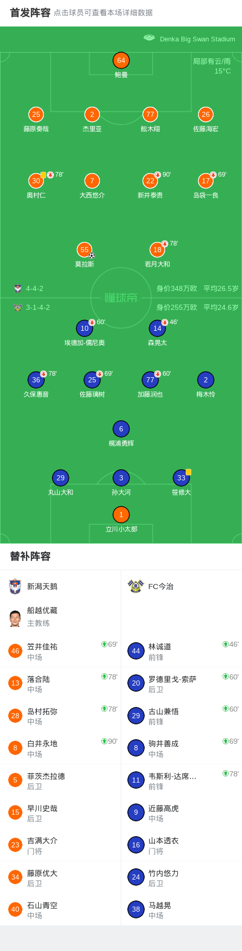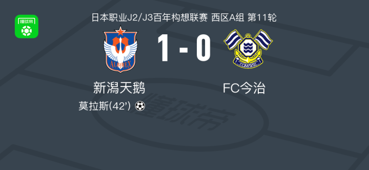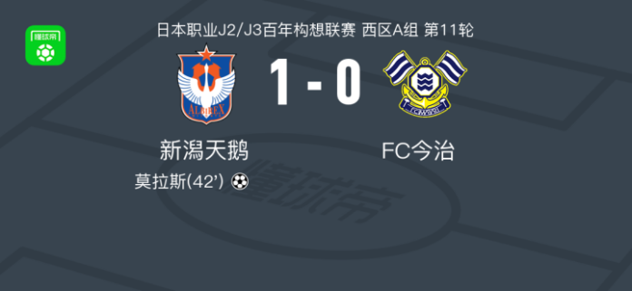 新潟天鹅1-0FC今治,莫拉斯制胜球 足球资讯 发布时间: 2026年4月18日 阅读时间: 少于1 分钟 FacebookXPinterestWhatsApp 新潟天鹅1-0FC今治,莫拉斯制胜球 北京时间4月18日日本职业J2/J3百年构想联赛 西区A组 第11轮,新潟天鹅主场对阵FC今治。新潟天鹅莫拉斯破门。最终比分新潟天鹅 1–0 FC今治。 点击查看本场比赛详细数据>> 点击查看日职J2/J3完整积分榜>> 精彩瞬间 第42分钟,新潟天鹅球员莫拉斯打入一球。 球队阵容 技术统计 FacebookXPinterestWhatsApp 1823100https://1823100.com 红单推荐 007 意杯 国际米兰vs科莫 红单推荐 2026年4月21日 005 西甲 毕尔巴鄂竞技vs奥萨苏纳 红单推荐 2026年4月21日 001 意甲 莱切vs佛罗伦萨 红单推荐 2026年4月20日 003 英超 水晶宫vs西汉姆联 红单推荐 2026年4月20日 019 英超 曼城vs阿森纳 红单推荐 2026年4月19日 热门资讯 004 欧冠 巴萨vs马竞 红单推荐 2026年4月8日 三人20+!火箭21分逆转太阳7连胜 KD24分阿门22+11+8 篮球资讯 2026年4月8日 007 意杯 国际米兰vs科莫 红单推荐 2026年4月21日 019 英超 曼城vs阿森纳 红单推荐 2026年4月19日 013 英超 西汉姆联vs狼队 红单推荐 2026年4月10日