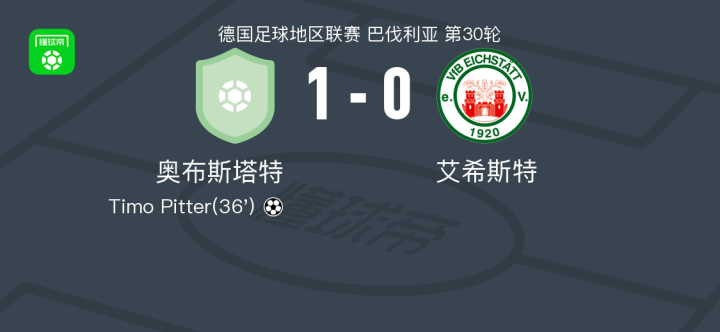 奥布斯塔特1-0艾希斯特,Timo Pitter制胜球 足球资讯 发布时间: 2026年4月22日 阅读时间: 少于1 分钟 FacebookXPinterestWhatsApp 奥布斯塔特1-0艾希斯特,Timo Pitter制胜球 北京时间4月22日德国足球地区联赛 巴伐利亚 第30轮,奥布斯塔特主场对阵艾希斯特。奥布斯塔特Timo Pitter破门。最终比分奥布斯塔特 1–0 艾希斯特。 点击查看本场比赛详细数据>> 精彩瞬间 第36分钟,奥布斯塔特球员Timo Pitter打入一球。 FacebookXPinterestWhatsApp 1823100https://1823100.com 红单推荐 015 西甲 巴萨vs塞尔塔 红单推荐 2026年4月22日 012 英超 伯恩茅斯vs利兹联 红单推荐 2026年4月22日 007 意杯 国际米兰vs科莫 红单推荐 2026年4月21日 005 西甲 毕尔巴鄂竞技vs奥萨苏纳 红单推荐 2026年4月21日 001 意甲 莱切vs佛罗伦萨 红单推荐 2026年4月20日 热门资讯 005 英超 曼联vs利兹联 红单推荐 2026年4月13日 004 欧冠 巴萨vs马竞 红单推荐 2026年4月8日 三人20+!火箭21分逆转太阳7连胜 KD24分阿门22+11+8 篮球资讯 2026年4月8日 007 意杯 国际米兰vs科莫 红单推荐 2026年4月21日 023 英超 利物浦vs富勒姆 红单推荐 2026年4月11日