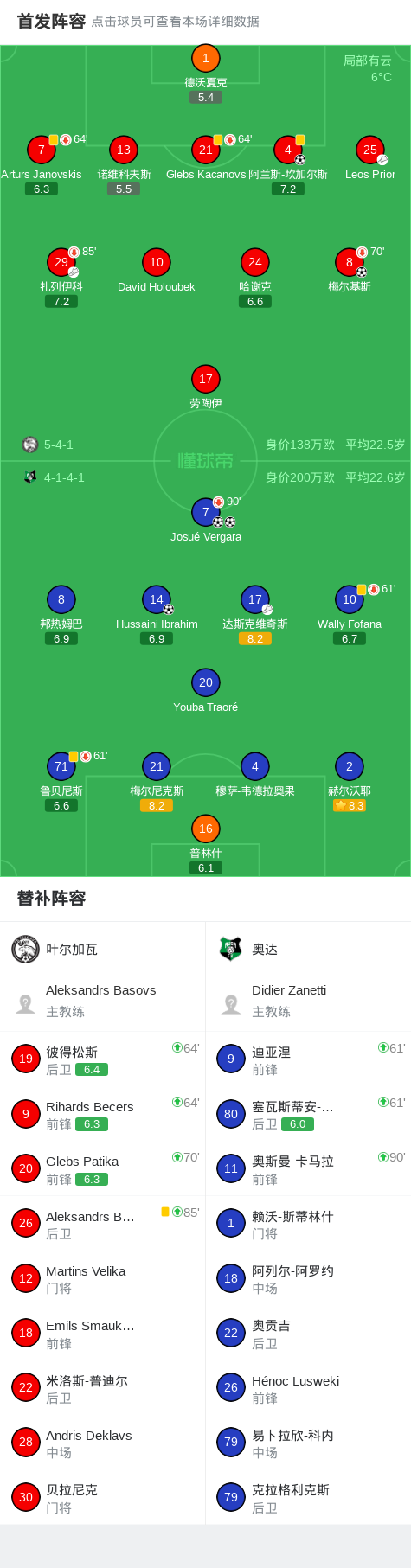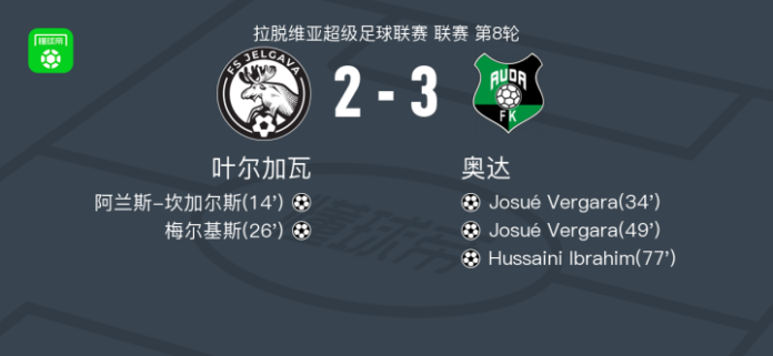 北京时间4月22日拉脱维亚超级足球联赛 联赛 第8轮,叶尔加瓦主场对阵奥达。叶尔加瓦阿兰斯-坎加尔斯破门,梅尔基斯破门。奥达Josué Vergara梅开二度,Hussaini Ibrahim破门。最终比分叶尔加瓦 2–3 奥达。