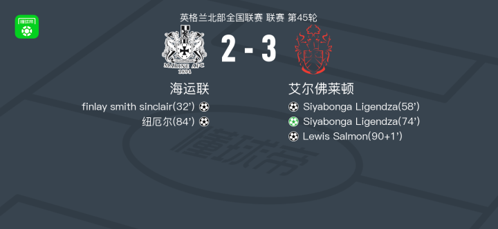 北京时间4月18日英格兰北部全国联赛 联赛 第45轮,海运联主场对阵艾尔佛莱顿。海运联finlay smith sinclair破门,纽厄尔破门。艾尔佛莱顿Siyabonga Ligendza梅开二度,Lewis Salmon破门。最终比分海运联 2–3 艾尔佛莱顿。