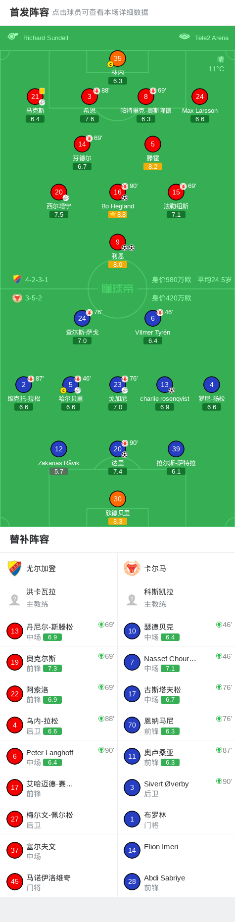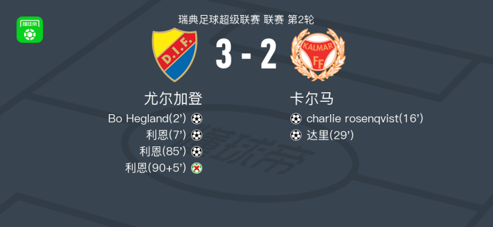 北京时间4月12日瑞典足球超级联赛 联赛 第2轮,尤尔加登主场对阵卡尔马。尤尔加登Bo Hegland破门,利恩梅开二度。卡尔马charlie rosenqvist破门,达里破门。最终比分尤尔加登 3–2 卡尔马。