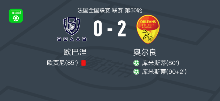 奥尔良2-0欧巴涅,库米斯蒂独中两元 足球资讯 发布时间: 2026年4月18日 阅读时间: 少于1 分钟 FacebookXPinterestWhatsApp 奥尔良2-0欧巴涅,库米斯蒂独中两元 北京时间4月18日法国全国联赛 联赛 第30轮,欧巴涅主场对阵奥尔良。奥尔良库米斯蒂梅开二度。最终比分欧巴涅 0–2 奥尔良。 点击查看本场比赛详细数据>> 点击查看法丙完整积分榜>> 精彩瞬间 第80分钟,奥尔良球员库米斯蒂罚入点球。 第85分钟,欧巴涅球队欧贾尼吃到红牌。 下半场补时第2分钟,奥尔良球员库米斯蒂罚入点球。 球队阵容 技术统计 FacebookXPinterestWhatsApp 1823100https://1823100.com 红单推荐 005 西甲 巴列卡诺vs西班牙人 红单推荐 2026年4月23日 003 西甲 莱万特vs塞维利亚 红单推荐 2026年4月23日 015 西甲 巴萨vs塞尔塔 红单推荐 2026年4月22日 012 英超 伯恩茅斯vs利兹联 红单推荐 2026年4月22日 007 意杯 国际米兰vs科莫 红单推荐 2026年4月21日 热门资讯 萨拉戈萨U19 0-0乌德山U19,双方握手言和 足球资讯 2026年4月12日 曼撒肯0-0哈马索斯,秋色平分 足球资讯 2026年4月23日 萨拉赫安菲尔德英超进108球,联赛历史单座球场进球仅次于亨利 足球资讯 2026年4月12日 萨拉赫英超打入157粒非点球进球,追平阿圭罗列历史第五 足球资讯 2026年4月12日 郑大世:森保一执教风格很有人情味;日本队还得日本人执教 足球资讯 2026年4月23日