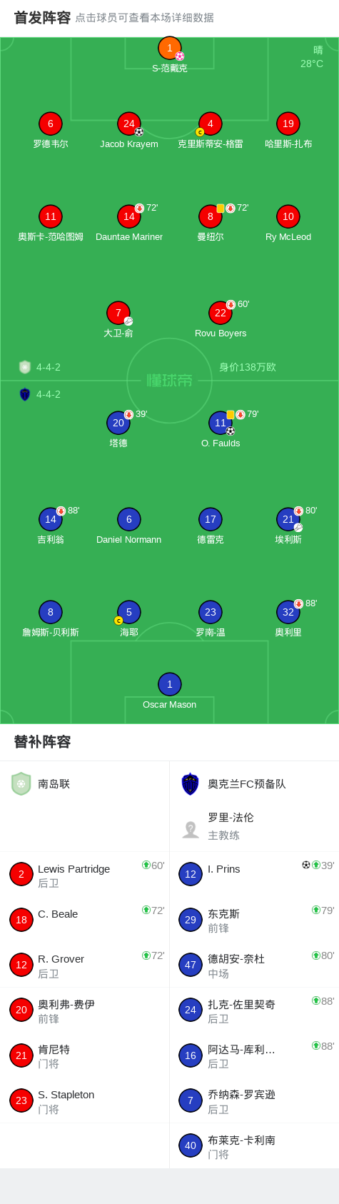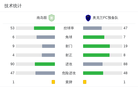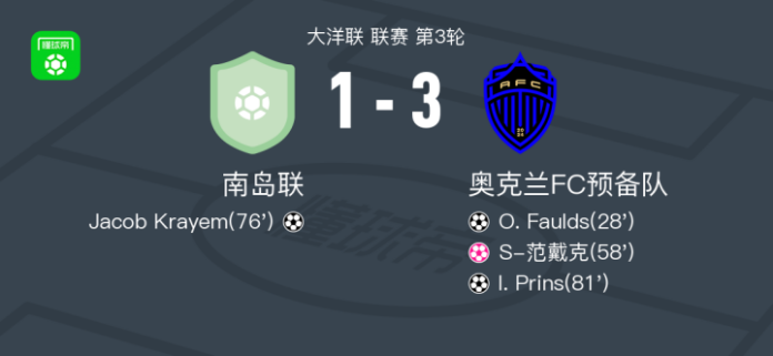 北京时间4月21日大洋联 联赛 第3轮,南岛联对阵奥克兰FC预备队。南岛联Jacob Krayem破门,S-范戴克自摆乌龙。奥克兰FC预备队O. Faulds破门,I. Prins破门。最终比分南岛联 1–3 奥克兰FC预备队。