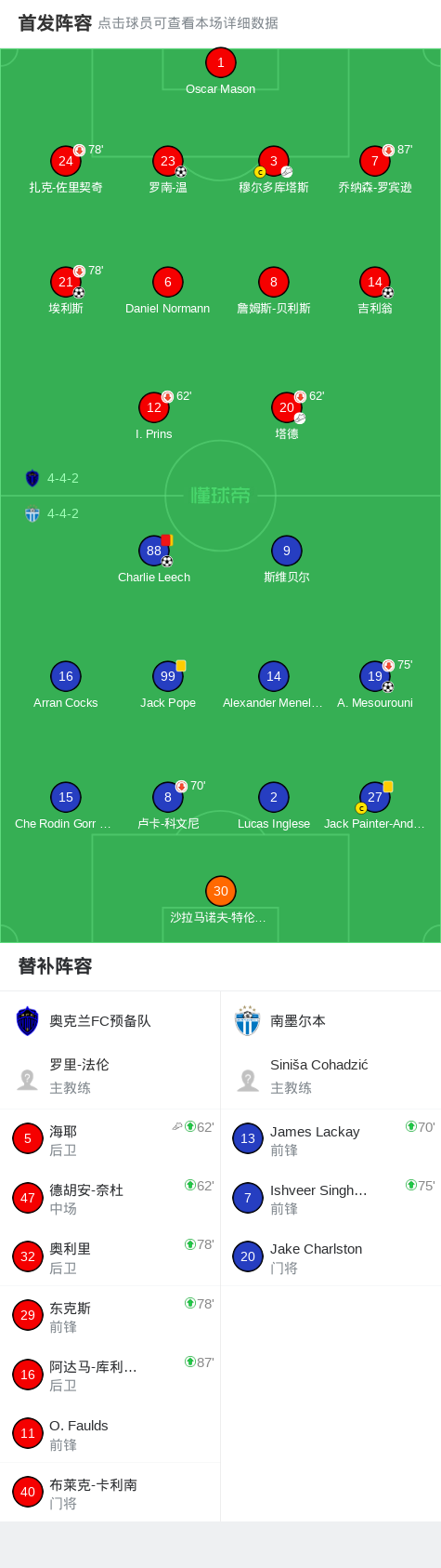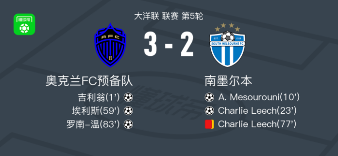 北京时间4月12日大洋联 联赛 第5轮,奥克兰FC预备队对阵南墨尔本。奥克兰FC预备队吉利翁破门,埃利斯破门,罗南-温破门。南墨尔本A. Mesourouni破门,Charlie Leech破门。最终比分奥克兰FC预备队 32 南墨尔本。