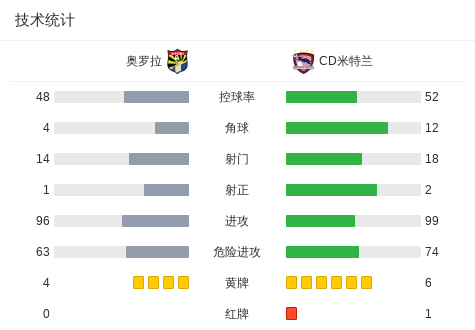 第64分钟,CD米特兰球队福莱科吃到红牌。