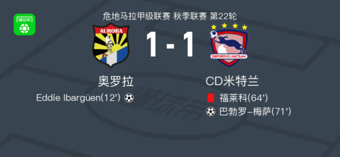 北京时间4月27日危地马拉甲级联赛 秋季联赛 第22轮,奥罗拉主场对阵CD米特兰。奥罗拉Eddie Ibargüen破门。CD米特兰巴勃罗-梅萨破门。最终比分奥罗拉 11 CD米特兰。