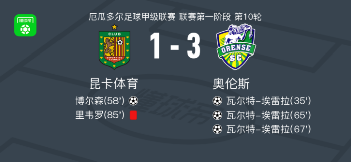 北京时间4月23日厄瓜多尔足球甲级联赛 联赛第一阶段 第10轮,昆卡体育主场对阵奥伦斯。昆卡体育博尔森破门。奥伦斯瓦尔特-埃雷拉帽子戏法。最终比分昆卡体育 1–3 奥伦斯。