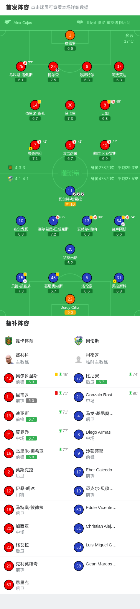 第65分钟,奥伦斯球员普卢阿斯助攻瓦尔特-埃雷拉打入一球。