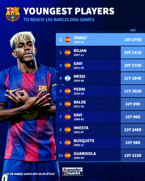 亚马尔完成150场时只有18岁零275天,是巴萨队史达到这一里程碑最年轻的球员。他打破了博扬的纪录——博扬在2011年完成150场时是20岁零141天,比亚马尔大了将近两岁。