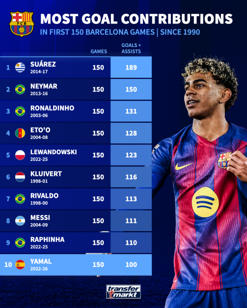 虽然没有晋级,但对于18岁的天才亚马尔来说,这依然是一个特殊的夜晚。他完成了自己在巴萨的第150次出场,同时也达成了个人在俱乐部的第100次进球参与(进球+助攻)。