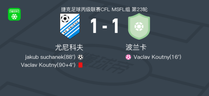 北京时间4月12日捷克足球丙级联赛CFL MSFL组 第23轮,尤尼科夫主场对阵波兰卡。尤尼科夫jakub suchanek破门,Vaclav Koutny自摆乌龙。最终比分尤尼科夫 1–1 波兰卡。