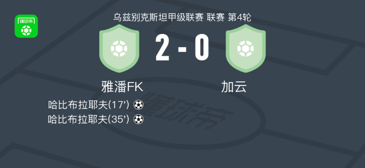 雅潘FK2-0加云,哈比布拉耶夫包办2球 足球资讯 发布时间: 2026年4月21日 阅读时间: 少于1 分钟 FacebookXPinterestWhatsApp 雅潘FK2-0加云,哈比布拉耶夫包办2球 北京时间4月20日乌兹别克斯坦甲级联赛 联赛 第4轮,雅潘FK主场对阵加云。雅潘FK哈比布拉耶夫梅开二度。最终比分雅潘FK 2–0 加云。 点击查看本场比赛详细数据>> 精彩瞬间 第17分钟,雅潘FK球员哈比布拉耶夫打入一球。 第35分钟,雅潘FK球员哈比布拉耶夫打入一球。 技术统计 FacebookXPinterestWhatsApp 1823100https://1823100.com 红单推荐 001 意甲 莱切vs佛罗伦萨 红单推荐 2026年4月20日 003 英超 水晶宫vs西汉姆联 红单推荐 2026年4月20日 019 英超 曼城vs阿森纳 红单推荐 2026年4月19日 007 英冠 伊普斯维奇vs米德尔斯堡 红单推荐 2026年4月19日 009 挪超 博德闪耀vs奥勒松 红单推荐 2026年4月18日 热门资讯 雷帕斯3-2逆转基芬,oliver helttunen、Timur Saltykov破门 足球资讯 2026年4月19日 001 欧联杯 塞尔塔vs弗莱堡 红单推荐 2026年4月16日 002 欧联 诺丁汉vs波尔图 红单推荐 2026年4月16日 铁人文明观赛倡议书:同心兴东北,场上是对手,场下是兄弟 足球资讯 2026年4月20日 足球报:深圳青年人靠“亲情牌”签下了罗德里格与梁诺恒 足球资讯 2026年4月20日