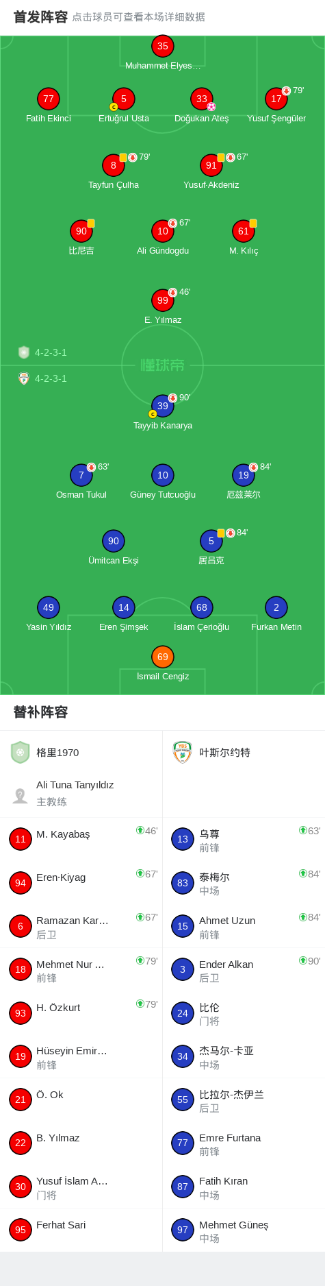 叶斯尔约特1-0格里1970 足球资讯 发布时间: 2026年4月12日 阅读时间: 少于1 分钟 FacebookXPinterestWhatsApp 叶斯尔约特1-0格里1970 北京时间4月12日土耳其丙级联赛 B组 第29轮,格里1970主场对阵叶斯尔约特。格里1970Doğukan Ateş自摆乌龙。最终比分格里1970 0–1 叶斯尔约特。 点击查看本场比赛详细数据>> 精彩瞬间 第13分钟,格里1970球员Doğukan Ateş自摆乌龙。 球队阵容 FacebookXPinterestWhatsApp 1823100https://1823100.com 红单推荐 002 欧联 诺丁汉vs波尔图 红单推荐 2026年4月16日 001 欧联杯 塞尔塔vs弗莱堡 红单推荐 2026年4月16日 006 欧冠 拜仁vs皇马 红单推荐 2026年4月15日 003 欧冠 利物浦vs巴黎圣日耳曼 红单推荐 2026年4月14日 005 英超 曼联vs利兹联 红单推荐 2026年4月13日 热门资讯 006 欧冠 拜仁vs皇马 红单推荐 2026年4月15日 005 英超 曼联vs利兹联 红单推荐 2026年4月13日 012 英超 诺丁汉森林vs阿斯顿维拉 红单推荐 2026年4月12日 003 欧冠 利物浦vs巴黎圣日耳曼 红单推荐 2026年4月14日 001 欧联杯 塞尔塔vs弗莱堡 红单推荐 2026年4月16日