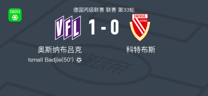 北京时间4月12日德国丙级联赛 联赛 第33轮,奥斯纳布吕克主场对阵科特布斯。奥斯纳布吕克Ismail Badjie破门。最终比分奥斯纳布吕克 10 科特布斯。