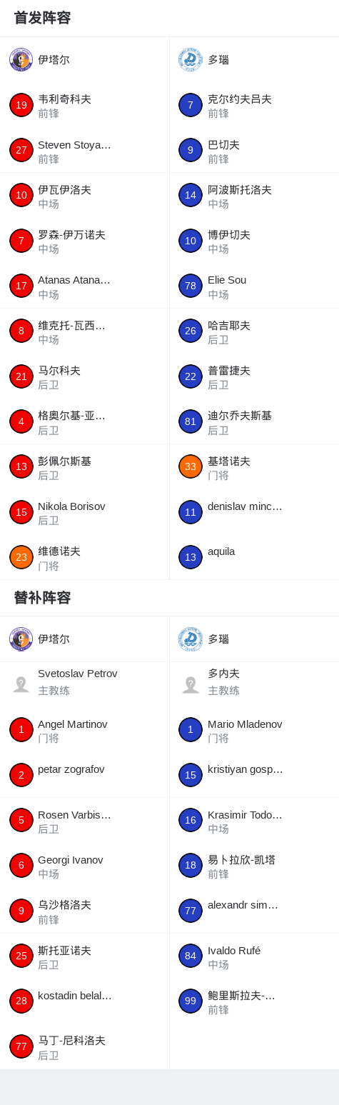 签到 欢迎!登录你的帐户 您的用户名 您的密码 忘记密码了吗?得到帮助 创建一个帐户 创建一个帐户 欢迎!注册一个帐户 您的电子邮件 您的用户名 密码将通过电子邮件发送给您。 找回密码 恢复您的密码 您的电子邮件 密码将通过电子邮件发送给您。 伊塔尔0-0多瑙,两队各拿一分 足球资讯 发布时间: 2026年4月13日 伊塔尔0-0多瑙,两队各拿一分 北京时间4月13日保加利亚足球乙级联赛 联赛 第28轮,伊塔尔主场对阵多瑙。最终比分伊塔尔 0–0 多瑙。 点击查看本场比赛详细数据>> 球队阵容 技术统计 留下评论 登录后即可发表评论 评论 (0)还没有人留下宝贵的评论~ 红单推荐 009 欧冠 马竞vs阿森纳 红单推荐 2026年4月29日 0 007 挪超 特罗姆瑟vs布兰 红单推荐 2026年4月29日 0 003 英冠 南安普顿vs伊普斯维奇 红单推荐 2026年4月28日 0 004 欧冠 巴黎圣曼vs拜仁 红单推荐 2026年4月28日 0 007 英超 曼联vs布伦特 红单推荐 2026年4月27日 0 热门资讯 马鲁特联7-0狂胜PSBS巴克伦佛,戴维-席尔瓦梅开二度,毛拉纳双响 足球资讯 2026年4月28日 0 004 欧冠 巴黎圣曼vs拜仁 红单推荐 2026年4月28日 0 006 欧冠 拜仁vs皇马 红单推荐 2026年4月15日 0 约基奇第198次三双!掘金大胜灰熊豪取10连胜 穆雷26+7+5 篮球资讯 2026年4月9日 0 三人20+!火箭21分逆转太阳7连胜 KD24分阿门22+11+8 篮球资讯 2026年4月8日 0