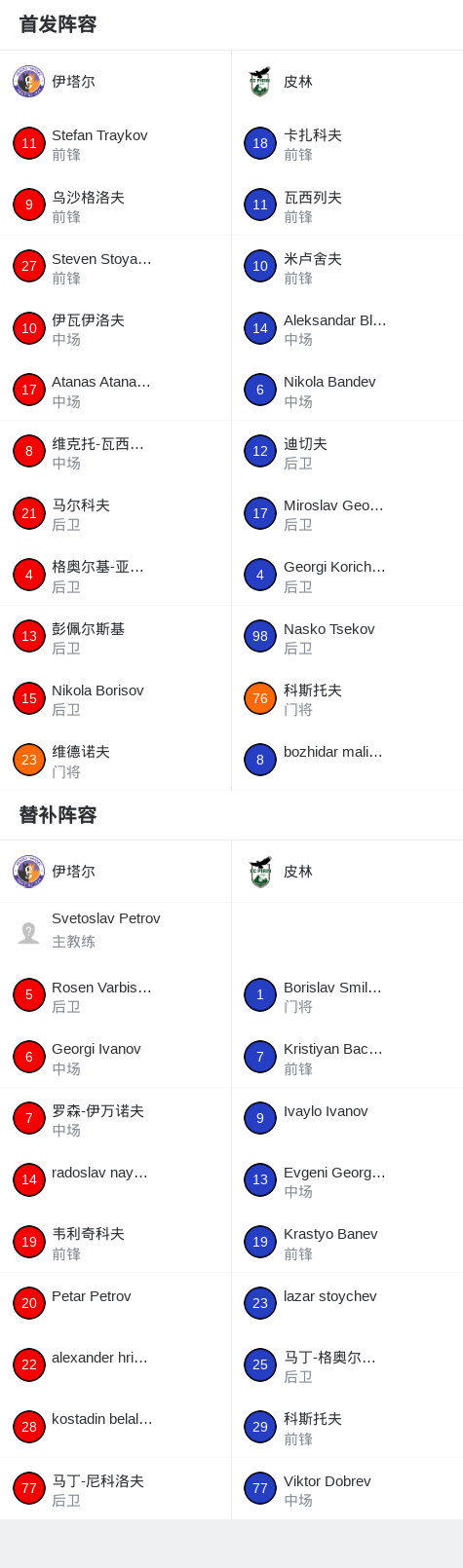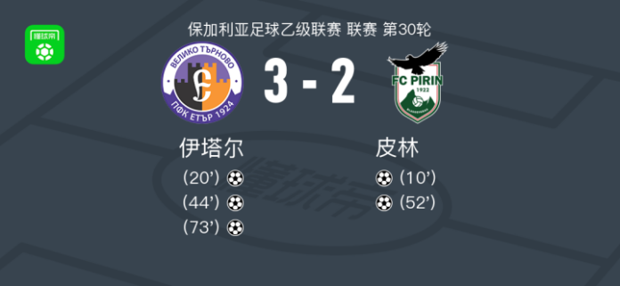 伊塔尔3-2逆转皮林 足球资讯 发布时间: 2026年4月26日 阅读时间: 少于1 分钟 FacebookXPinterestWhatsApp 伊塔尔3-2逆转皮林 北京时间4月25日保加利亚足球乙级联赛 联赛 第30轮,伊塔尔主场对阵皮林。最终比分伊塔尔 3–2 皮林。 点击查看本场比赛详细数据>> 精彩瞬间 第10分钟,皮林球员打入一球。 第20分钟,伊塔尔球员打入一球。 第44分钟,伊塔尔球员打入一球。 第52分钟,皮林球员打入一球。 第73分钟,伊塔尔球员打入一球。 球队阵容 技术统计 FacebookXPinterestWhatsApp 1823100https://1823100.com 红单推荐 021 西甲 奥萨苏纳vs塞维利亚 红单推荐 2026年4月26日 013 英足总杯 切尔西(中)vs利兹联 红单推荐 2026年4月26日 023 英超 阿森纳vs纽卡斯尔 红单推荐 2026年4月25日 016 英超 狼队vs热刺 红单推荐 2026年4月25日 013 英超 桑德兰vs诺丁汉 红单推荐 2026年4月24日 热门资讯 官方:贺希宁当选本赛季CBA常规赛MVP 篮球资讯 2026年4月26日 马竞官方:巴里奥斯左大腿肌肉受伤,回归时间取决于恢复情况 足球资讯 2026年4月26日 阿贾克斯女足0-0费耶诺德女足,秋色平分 足球资讯 2026年4月26日 阿拉德纺织厂0-0康斯坦察灯塔,平分秋色 足球资讯 2026年4月26日 额尔齐斯河鄂木斯克1-1米阿斯,Grigoriy Borisenko破僵,Bilal Bilalov扳平 足球资讯 2026年4月26日